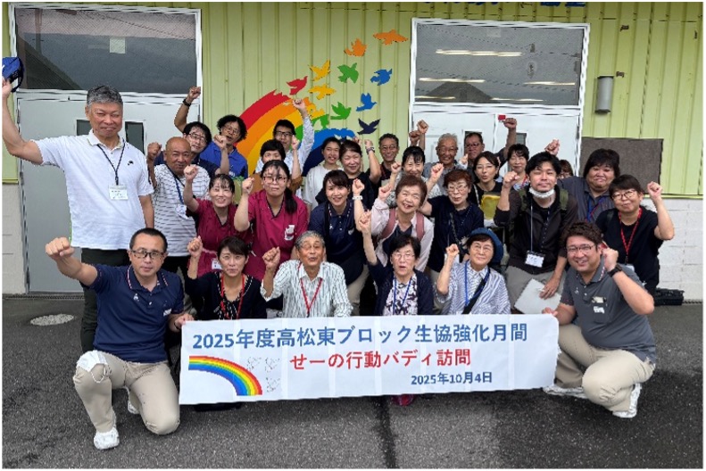 10/4(土)午後から生協強化月間「せーの行動」を行いました。当日は雨の予報でしたが、昼から時々晴れ間もみえる陽気となり、職員22人・組合員19人合計41人がバディを組んで出発しました。健康まつりや健診のお誘いも兼ねて242件の訪問を行い、143人と対話が出来て様々な声が聞けました。中には健診未受診のため連絡して欲しいとか、名義変更が出来て組合員加入目標を達成した支部もありました。嬉しいことに高松協同病院の事を褒めてくださるご意見もありました。そして何より組合員さんの顔を見てお話が出来たことが職員にとっても組合員さんにとっても元気になれたひと時でした。